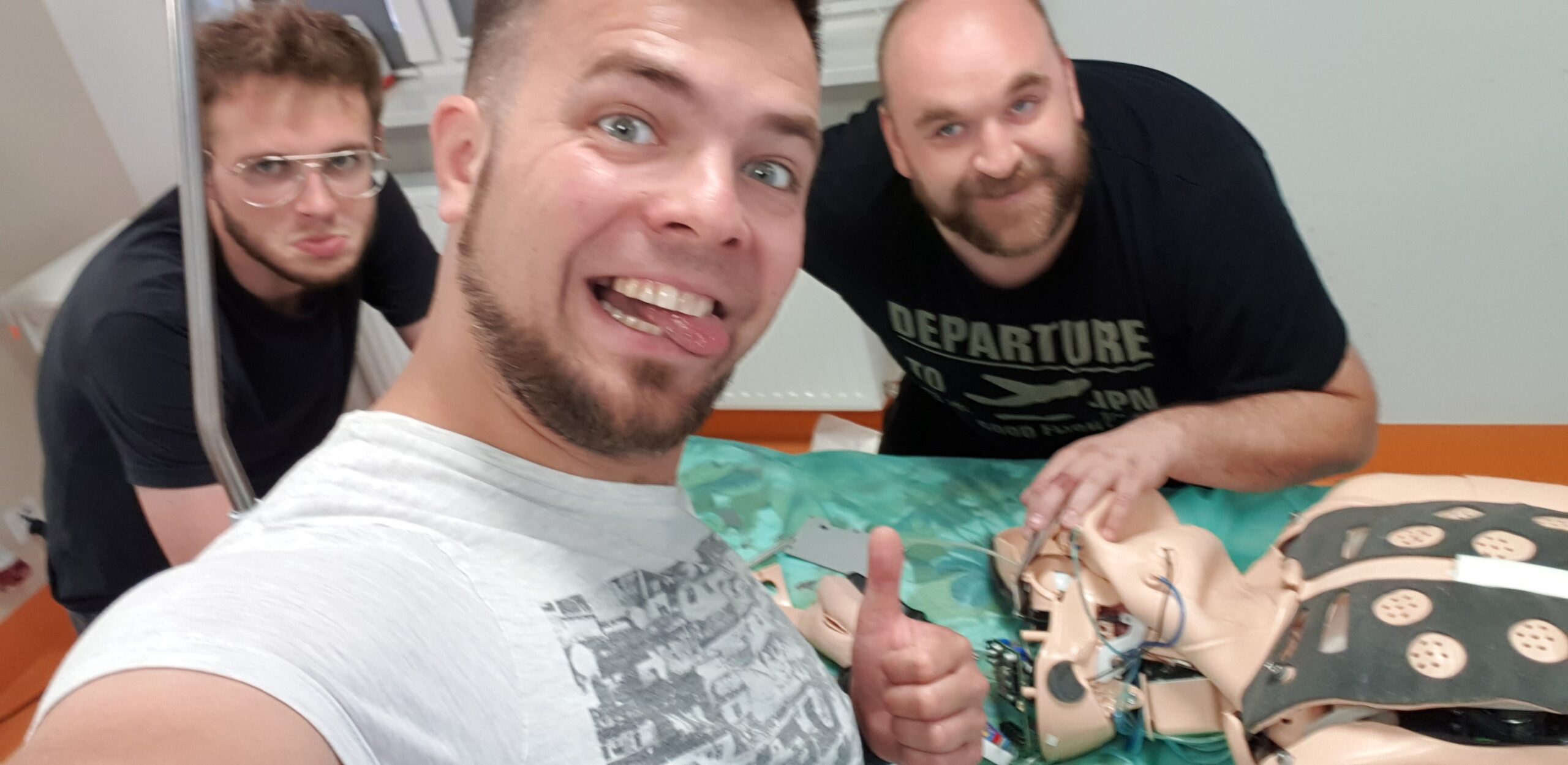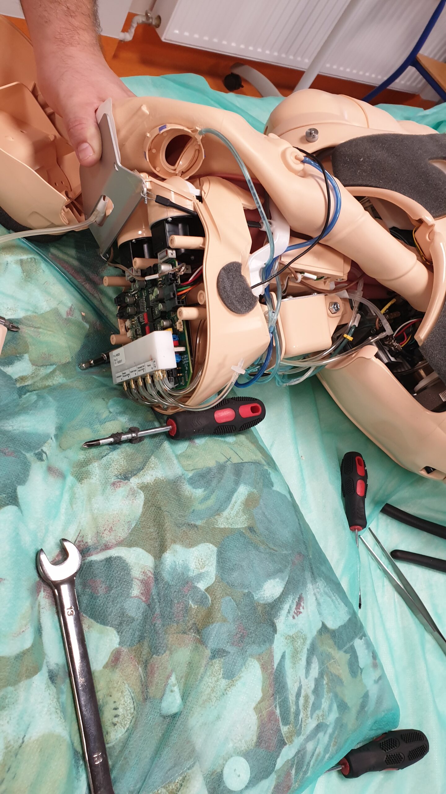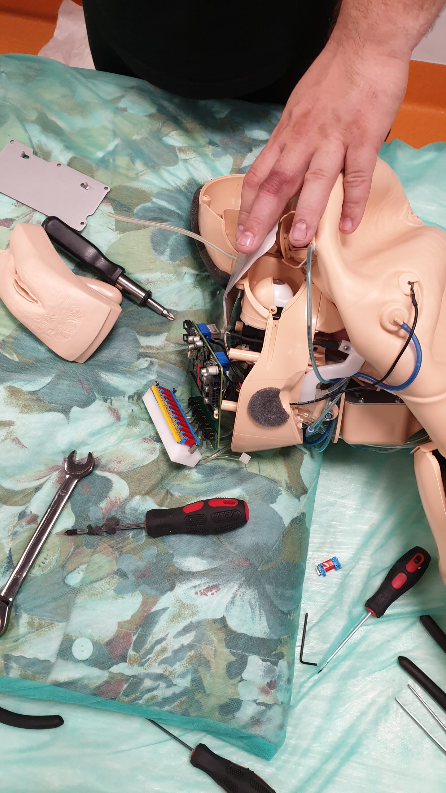 Jeśli chodzi o nas, to wbrew pozorom, nie odpoczywamy. Wręcz przeciwnie, gdyż przerwa wakacyjna to dla naszych techników świetna okazja by „pogrzebać” nieco więcej w symulatorach i na swój sposób przywrócić im pełnię życia przed zbliżającym się semestrem. Zaawansowane testy i prace serwisowe nad naszym George’em Stevenson’em (SimMan 3G) możecie podziwiać na poniższych zdjęciach…laughing