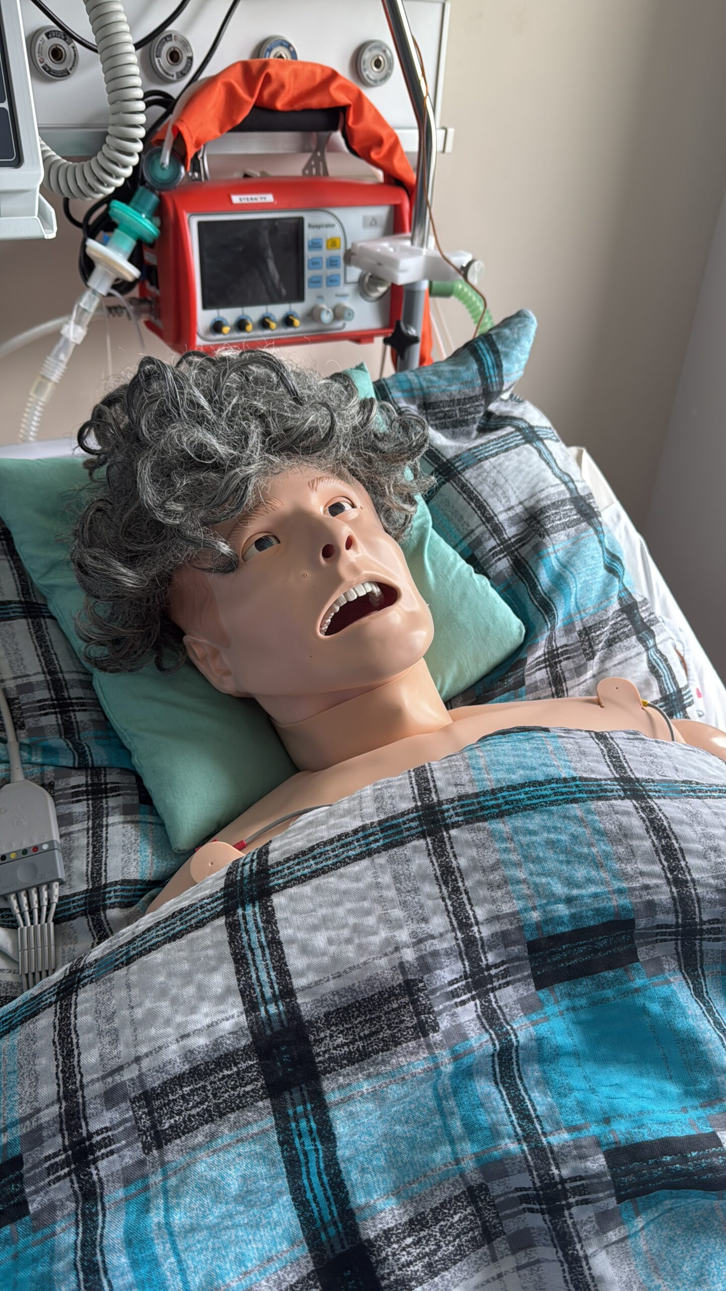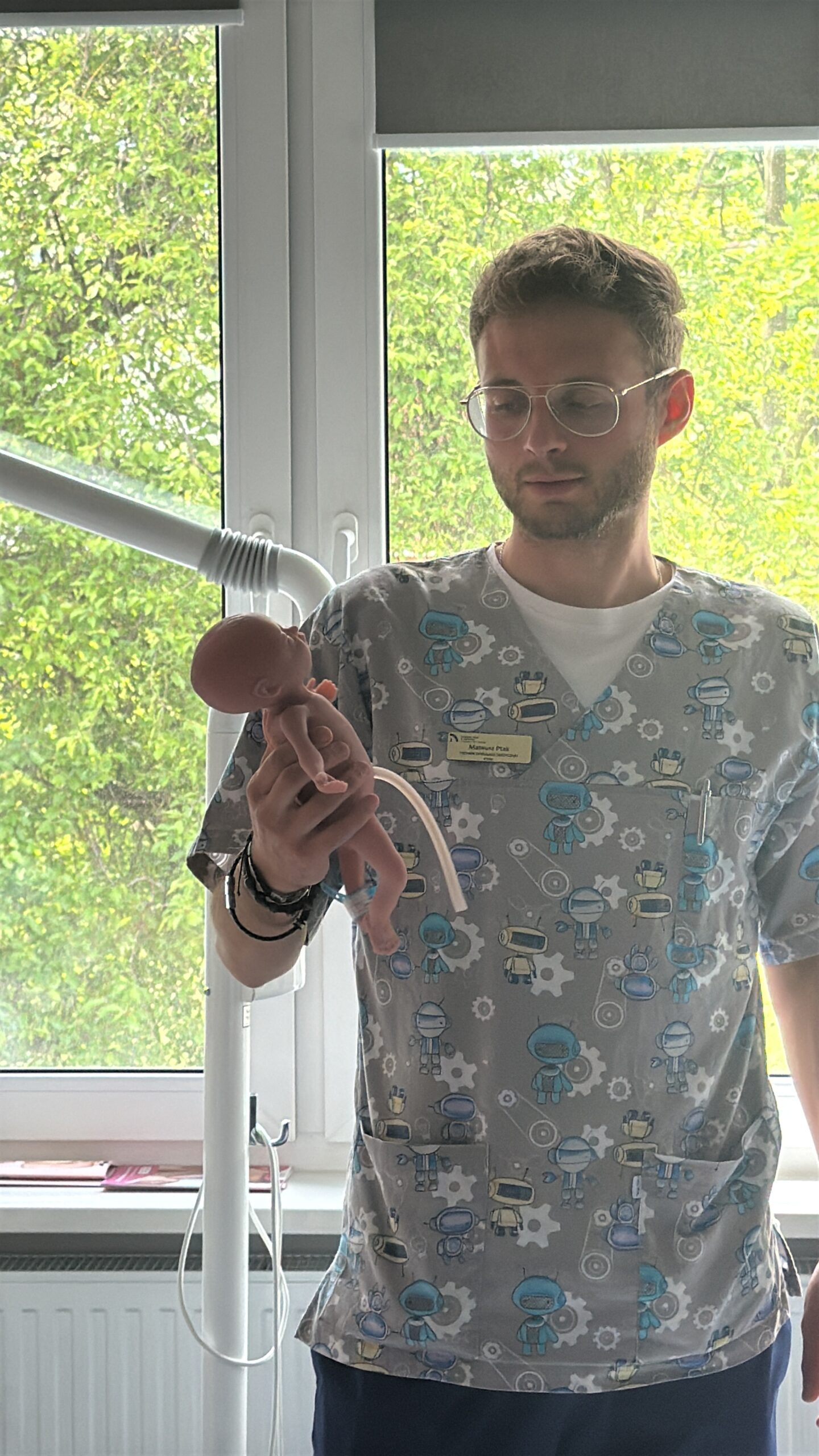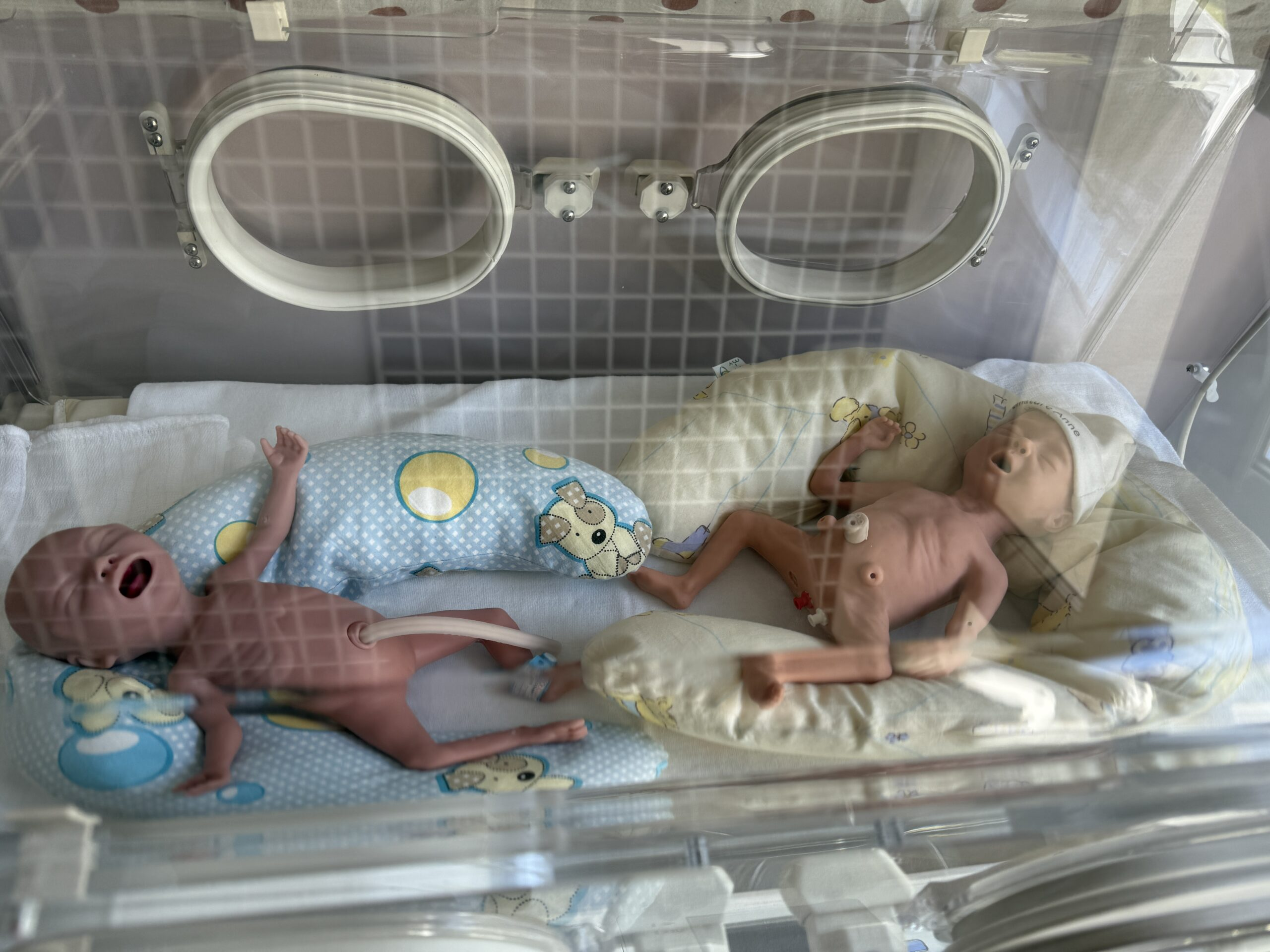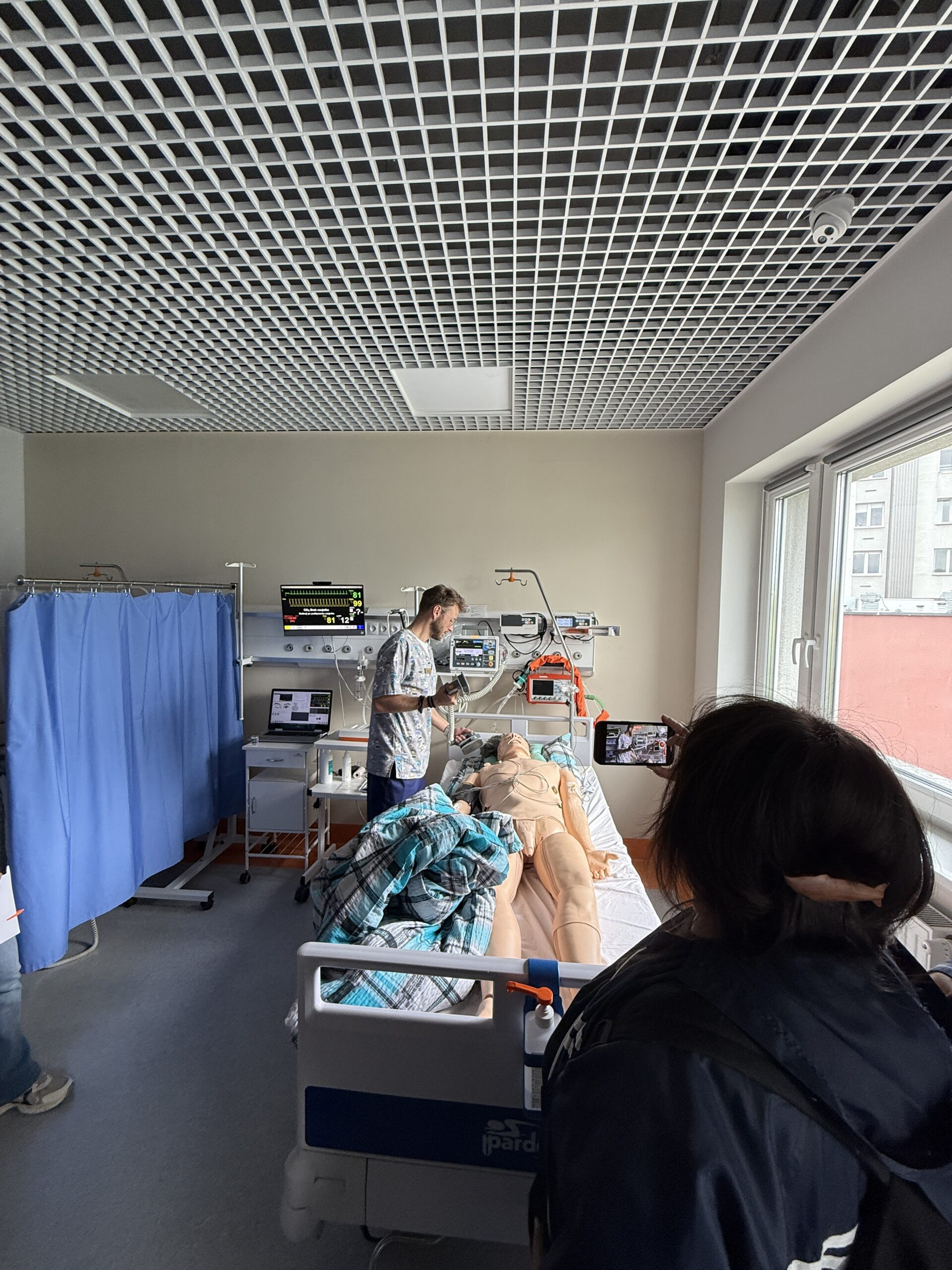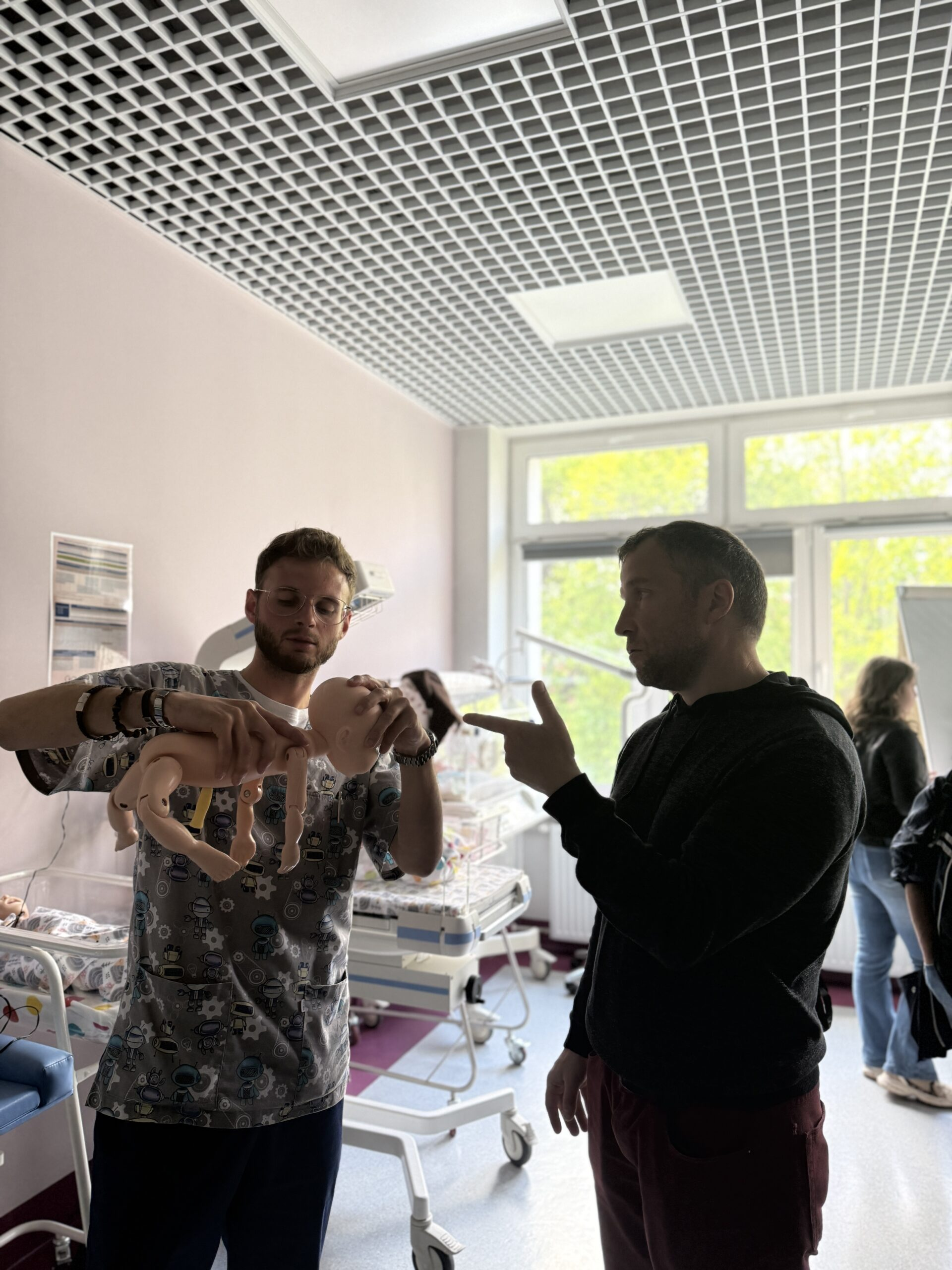 Pierwszym punktem „wycieczki” były pracownie podstawowych umiejętności pielęgniarskich i położniczych, a także sala ALS i BLS. Na tym etapie nasi goście zapoznali się – pod kątem funkcjonalności i zasad działania – z symulatorami, fantomami i trenażerami, wykorzystywanymi do kształcenia studentów na kierunkach proponowanych przez Wydział Nauk o Zdrowiu. W drugim etapie, omówiony został blok wysokiej wierności, gdzie na co dzień odbywają się zajęcia z wykorzystaniem zaawansowanych symulacji medycznych i to właśnie podczas nich, przyszli medycy muszą sobie radzić z wielowymiarowymi scenariuszami przypadków klinicznych. Wspomniane zostały również typowo organizacyjno-techniczne aspekty takich ćwiczeń, umiejscowione w tzw. „sterowni”, a więc urządzenia operujące oraz cały system rejestrujący audio-wideo. Nie obyło się także bez wizyty w salach debriefingu, gdzie zwykle odbywa się szczegółowa analiza zdarzeń symulacyjnych. Podobnie było i tym razem, gdyż nasi wizytatorzy wzięli udział w prezentacji nagrania z przebiegu symulowanego porodu.