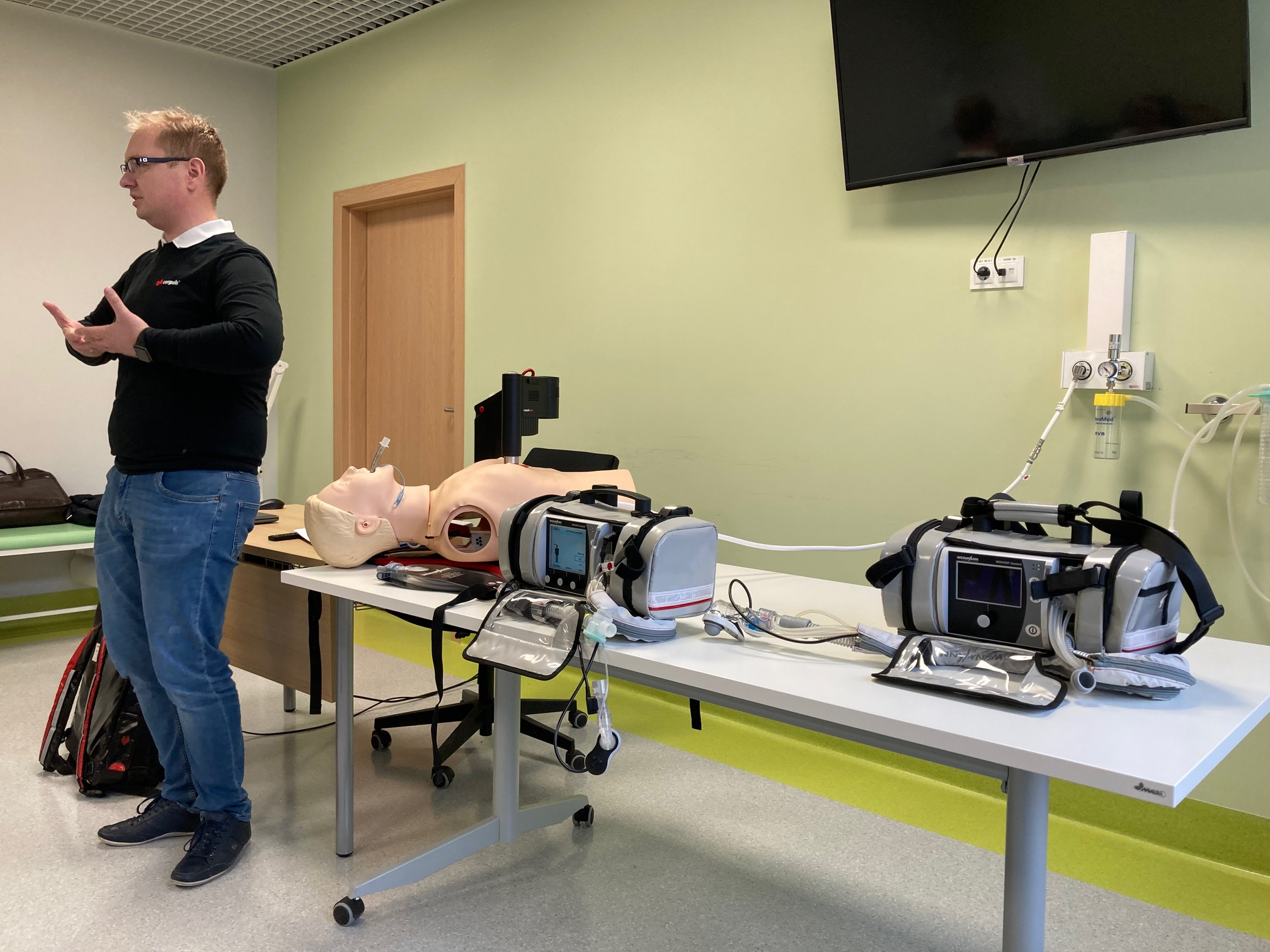 Pomimo braku zajęć dydaktycznych w Innowacyjnym Centrum Symulacji Medycznej, spowodowanym sesją egzaminacyjną, na salach mają miejsce różnego typu dodatkowe warsztaty oraz szkolenia. Jednym z nich był instruktaż dotyczący respiratora ratowniczego oraz urządzenia do mechanicznej kompresji klatki piersiowej.