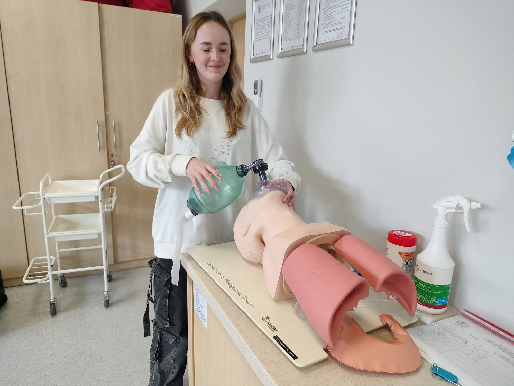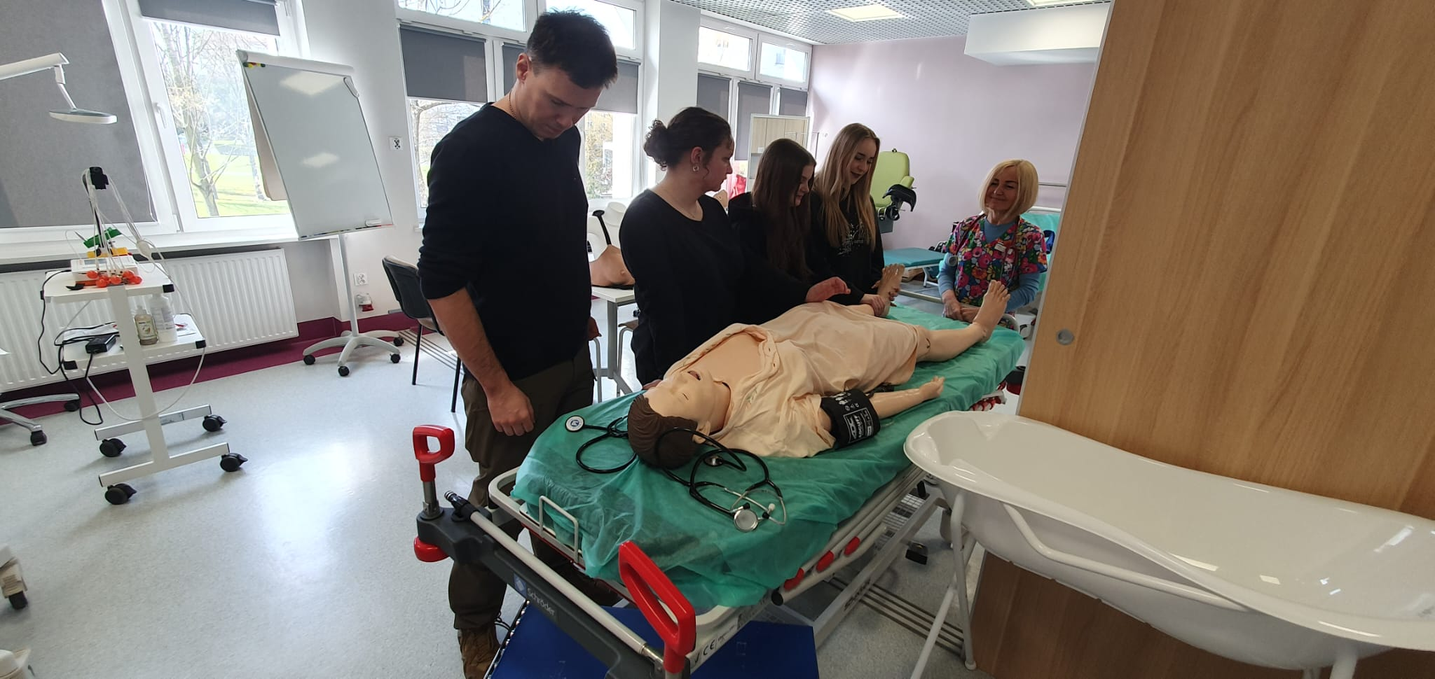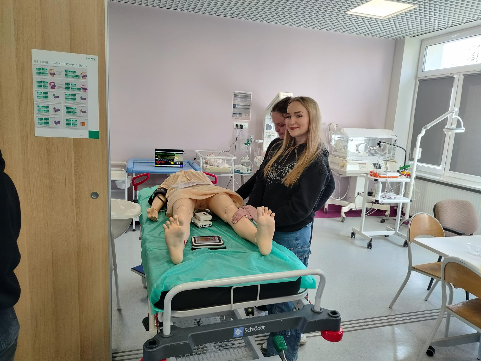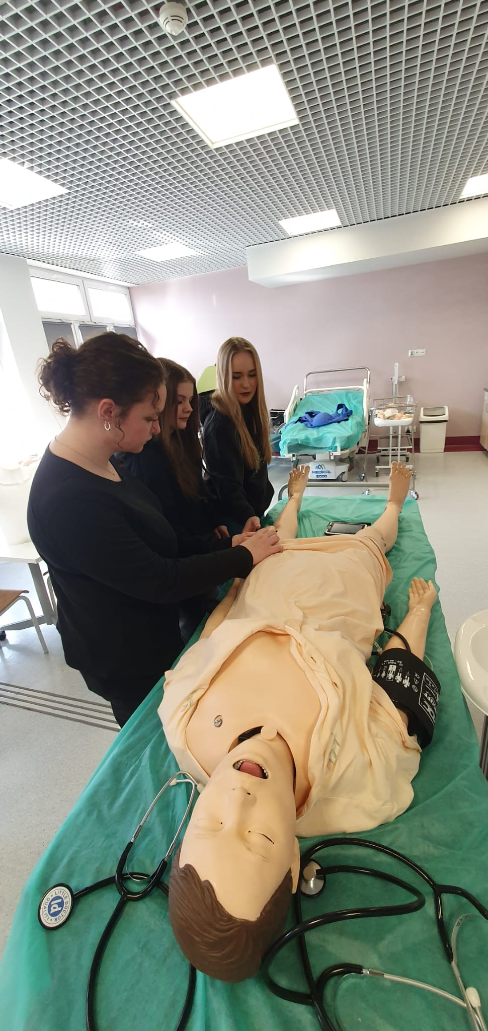 „Badania fizykalne” z Panią mgr Elżbietą Sobaszek, na których to zajęciach uczniowie mieli możliwość pracować i przetestować trenażery i symulatory przystosowane do ćwiczeń o tym charakterze,