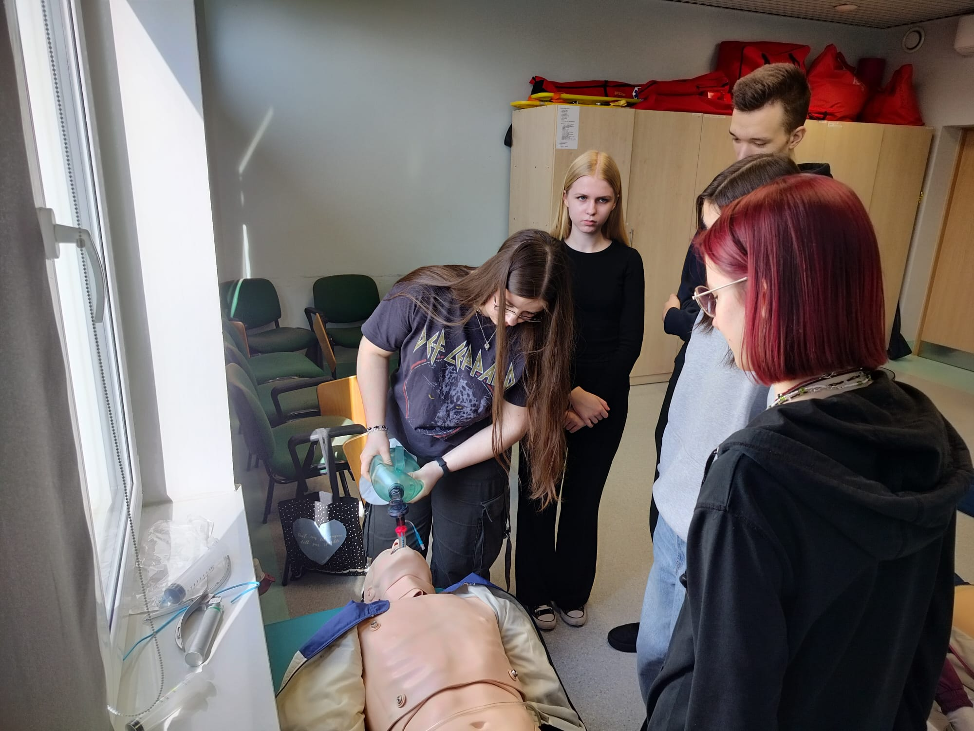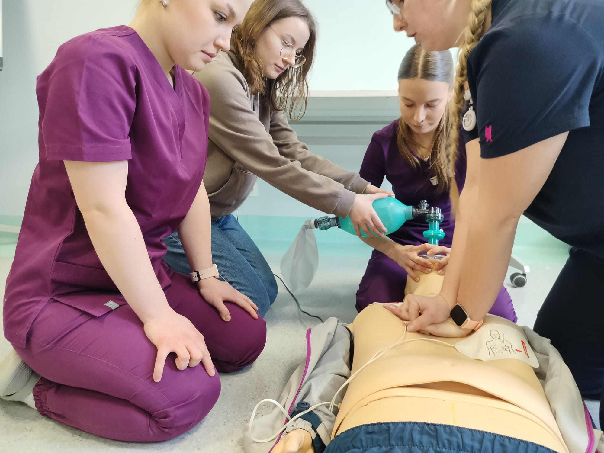 „Podstawy ratownictwa medycznego” z Panem mgr. Dawidem Obłojem, gdzie zostały przedstawione podstawowe i zaawansowane zabiegi resuscytacyjne wraz z użyciem automatycznego defibrylatora zewnętrznego AED,